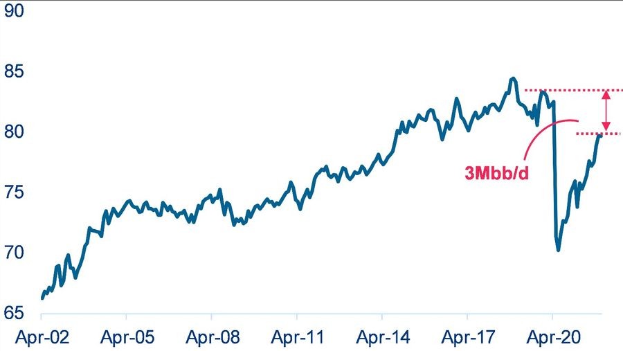 Cu toate acestea, conform analistilor Allianz, Europa ar putea implementa imediat un embargo asupra petrolului rusesc. Rusia furnizeaza aproximativ 3 milioane de barili pe zi (Mbb/zi) de petrol pietelor globale. Desi nu toata aceasta cantitate ajunge in Europa, este un punct de referinta util pentru volumul de petrol care ar trebui inlocuit de alti furnizori pentru a echilibra oferta si a stabiliza preturile in cazul unui embargo. Numai OPEC ar putea inlocui cele 3 Mbb/zi de petrol daca isi creste productia medie de la 28,2 Mbb/zi in primul trimestru din 2022 la nivelul din semestrul II din 2018. Se preconizeaza ca o eventuala revenire la acest nivel nu ar trebui sa dureze mai mult de o luna sau doua. Mai mult, se estimeaza ca producatorii occidentali de petrol din afara OPEC (Norvegia, SUA, Marea Britanie) vor putea furniza 0,5 Mbb/zi de petrol in plus pe pietele europene pe termen scurt. In ceea ce priveste productia globala de petrol, aceasta este in prezent cu aproximativ 3 Mbb/zi sub nivelul pre-Covid-19 (a se vedea figura 1), in timp ce productia rusa este aceeasi ca inainte de pandemie. Prin urmare, ceilalti producatori ar trebui sa poata reduce acest decalaj.