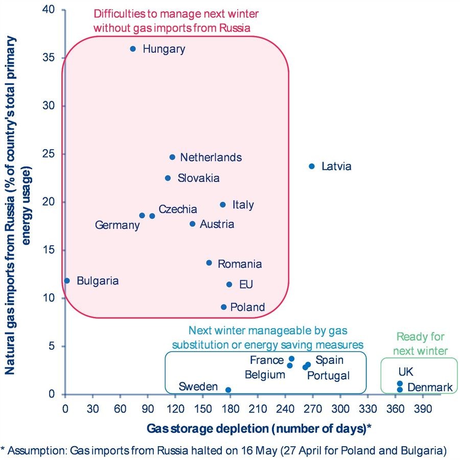 Pentru a vedea ce tari europene ar putea face fata opririi importurilor de gaze naturale din Rusia si care s-ar chinui iarna viitoare fara gazul rusesc, analistii au simulat evolutia rezervelor de gaze din instalatiile de stocare ale tarilor europene pentru urmatoarele 12 luni. Pentru fiecare tara au fost luate in considerare urmatoarele variabile: cantitatea curenta de gaz din depozite; tendinta anuala a consumului zilnic de gaze (media pe 10 ani), pentru a tine cont de consumul mai mic de gaze din lunile de vara; ipoteza ca aprovizionarea cu gaze care nu sunt din Rusia va continua (dar nu va creste), precum si scenariul ca importurile de gaze din Rusia ar fi oprite pe 16 mai.