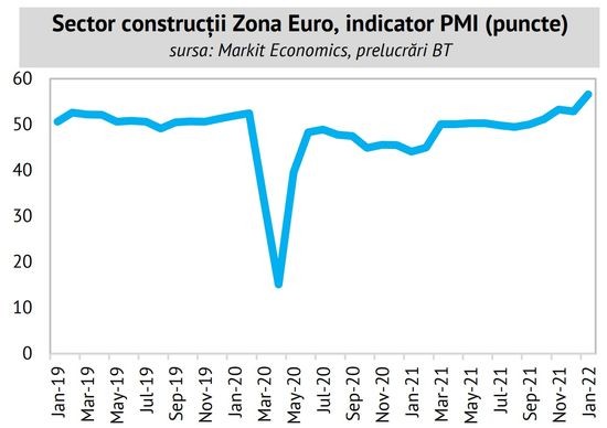 Markit Economics a publicat vineri statisticile cu privire la evolutia indicatorului PMI (Purchasing Managers Index) din sfera sectorului de constructii din Zona Euro (principalul partener economic al Romaniei) in prima luna a anului curent. Acest indicator, realizat pe baza unui sondaj la care participa 650 de companii din sectorul de constructii, evidentiaza evolutia comenzilor noi, productiei, locurilor de munca, stocurilor, preturilor si perspectivelor, cu mentiunea ca pragul de 50 de puncte separa cresterea de scadere. Datele exprima consolidarea procesului de relansare postpandemie la nivelul acestui sector intensiv in capital si forta de munca in ianuarie 2022, cu un ritm in accelerare, evolutie sustinuta de nivelul redus al costurilor reale de finantare si de implementarea programelor lansate la nivelul Uniunii Europene dupa incidenta pandemiei (Next Generation si cadrul financiar multianual 2021-2027), potrivit unei analize publicate de Banca Transilvania.