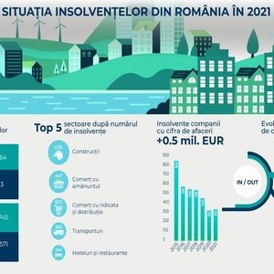 Cel mai recent studiu Coface Romania arata ca in anul 2021 s-au deschis 6.113 proceduri noi de insolventa, in crestere cu 10% fata de nivelul anului anterior, dar in continuare sub nivelul inregistrat inainte de impactul pandemiei Covid-19 pe plan local. Pierderile companiilor care au intrat in insolventa au inregistrat o crestere accelerata. Numarul de angajati raportat de firmele insolvente in perioada analizata este de aproape 30.000. Pentru 2022, reprezentantii Coface Romania estimeaza ca numarul insolventelor va creste, din nou, cu 10%, fiind asteptate dificultati financiare inclusiv pentru companiile de dimensiuni medii si mari. Cele mai multe insolvente deschise in anul 2021 au fost inregistrate in sectorul constructiilor (1.115), majoritatea societatilor in dificultate fiind reprezentata de firme mici, afectate grav de cresterea salariului minim impus si de scumpirea materiilor prime.