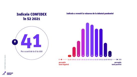 ,,Scaderea indicelui CONFIDEX la un nivel similar cu cel de la inceputul pandemiei vine pe fondul accentuarii unor efecte pe termen lung ale crizei Covid-19, precum perturbarile din lanturile de aprovizionare ce afecteaza in mod direct productia industriala. De asemenea, sunt si cateva efecte pe termen scurt, generate de criza politica si de valul IV care destabilizeaza perspectivele fortei de munca. CONFIDEX S2 2021 ne arata nu doar ca managerii si-au pierdut o buna parte din incredea in economie, ci si o posibila reintrare in recesiune, indicata de un procent foarte mare, 41% dintre manageri. Practic intelegem ca se suprapun doua crize - cea sanitara si perspectiva unei eventualenoi crize economice, in care economia este lovita de scumpirea energiei, crestera preturilor si alte efectele directe ale crizei sanitare. Iar revenirea din aceste crize este estimata intr-un orizont de minimum doi ani, dar chiar trei ani si jumatate pentru economia romaneasca pe ansamblu.” a declarat Andrei Cionca, CEO & Co-founder Impetum Group.