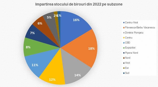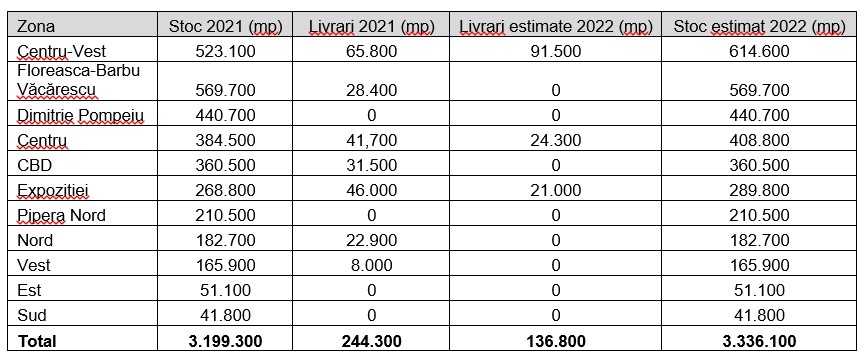 In zona Floreasca-Barbu Vacarescu, la sfarsitul lui 2021 erau construite proiecte totalizand 569.700 metri patrati, iar pentru 2022 nu este anuntat niciun proiect nou, astfel ca stocul va fi sub cel din Centru Vest si va reprezenta 16% din suprafata totala de birouri moderne din Bucuresti.