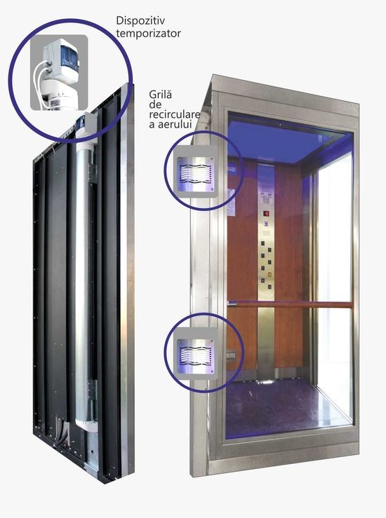 Acest sistem, prin recircularea aerului, neutralizeaza in proportie de pana la 99 %, bacteriile, virusii si fungii existenti in aerul din cabina ascensorului, fara niciun risc pentru persoanele aflate in cabina.