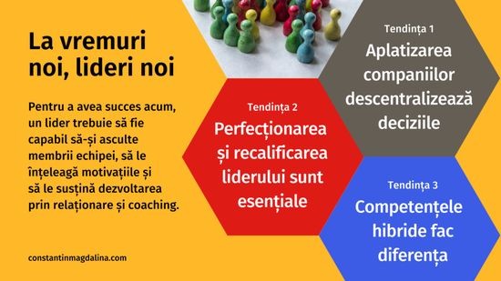 In acest context, imaginea despre ceea ce este liderul se schimba. Liderul „erou-individual” sau „cea mai desteapta persoana din companie” care trebuie sa stie totul si sa faca micromanagement este de domeniul trecutului. Structurile mai plate necesita lideri colaborativi, agili, bine conectati in retea si interfunctionali, care se pot adapta cu agilitate la situatii complexe si ambigue.
