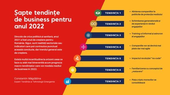 Sfarsitul de an este momentul bilanturilor. Al evaluarilor de orice fel. Decidentii companiilor se uita in micromediul lor de functionare si fac planuri pentru anul ce vine pe baza macro-prognozelor. Dincolo de criza politica si sanitara, anul 2021 a fost unul de crestere pentru Romania.Sigur, sunt realitati sectoriale sau indicatori care pot contrazice punctual aceasta concluzie, dar trendul general este de crestere. Exista multa incertitudine la orizont ceea ce face cu atat mai binevenita acum prognoza macro-tendintelor care vor modela mediul de business in 2022, precum si deciziile liderilor companiilor. Asadar macro-tendintele care se profileaza in acest moment sunt urmatoarele: