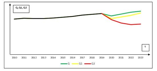 Figura 1 ilustreaza aceasta situatie prin distinctia intre PIB (Q) asa cum este surprins in statistici si Q1 (M), care ar exprima multumirea la nivel agregat si care tine cont de deteriorarea vietii/traiului. Exista in diagrama si traiectoria Q2, care ar ar exprima evolutia PIB, a vietii noastre, daca nu s-ar fi luat masuri de protectie si de combatere a Covid-19 – se vede astfel un colaps mare si prelungit al activitatii economice cu inerenta deteriorare a vietii umane, in principal cauzata de o criza sanitara cumplita si o criza economica si sociala adanca.