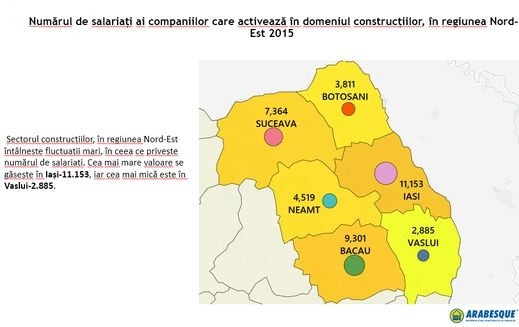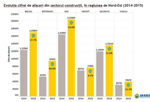 Potrivit analizei KeysFin, in 2015, in Iasi erau inregistrate 1.546 de firme de constructii, cu 11.153 de angajati. La polul opus se situau judetele Vaslui, unde erau numai 540 de companii, cu 2.885 de salariati, si Botosani, cu 448 de firme si 3.811 angajati.