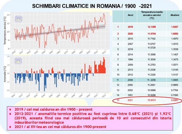 Anul 2021 inregistreaza o temperatura medie anuala de 10.90oC, abaterea termica fiind de 0.69oC fata de media perioadei 1981-2020, ceea ce confirma tendinta evidenta de crestere a temperaturii aerului din ultimele decenii.