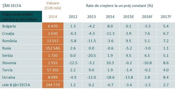 "In cele patru tari membre ale Uniunii Europene (Bulgaria, Croatia, Romania si Slovenia) piata constructiilor pare sa fi ajuns la un nivel minim, urmand sa aiba loc o crestere in 2017. Exista doua tipare de dezvoltare. In primul rand, in Romania si in Croatia - deja din anul 2015 - se estimeaza ca rezultatele generale in domeniul constructiilor vor inregistra o crestere, acest domeniu continuand sa se dezvolte substantial in 2016 si 2017. In al doilea rand, s-a anticipat ca Bulgaria si Slovenia au cunoscut in 2015 o diminuare a dezvoltarii in domeniul constructiilor, urmata de o noua scadere in 2016, insa in ambele tari ar trebui sa aiba loc o dezvoltare substantiala in 2017. Candidatul UE, Serbia, are parte din nou de crestere, inregistrand o rata pozitiva in domeniul constructiilor in 2015, ce va fi urmata de o noua crestere atat in 2016, cat si in 2017", se arata in raportul EECFA prezentat in cadrul celei de-a 80-a editii a Conferintei Euroconstruct, organizata de Buildecon (centru de coordonare si cercetare al EECFA) in decembrie 2015.