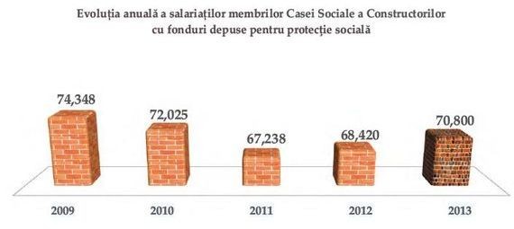 - Daca in iarna 2011-2012 suma medie consumata pentru un lucrator din constructii (incluzand si obligatiile bugetare aferente societatii) a fost de circa 1.088 de lei/ salariat, suma medie platita in iarna 2013 - 2014 a fost de 1.206 lei/ salariat, cu 73 de lei mai mica decat cea din sezonul 2012-2013, din cauza schimbarilor structurale de personal intervenite la nivelul societatilor membre, dar si a afilierii la CSC a unor noi companii care au acordat protectie sociala, salariul mediu tarifar fiind diferit de la o firma la alta.