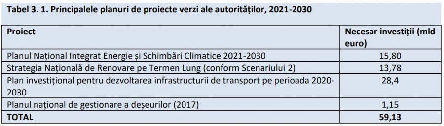 Proiecte cu o valoare totala de aproape 60 miliarde euro vor fi implementate de autoritati publice si private pana in anul 2030, potrivit calculelor Grupului de lucru din Comitetul National pentru Supravegherea Macroprudentiala (CNSM) si prezentate in raportul anual al organizatiei. Spre comparatie, suma reprezinta totalul investitiilor derulate de sectorul public in ultimii opt ani (63,5 miliarde euro in intervalul 2013-2020) sau totalul alocarilor de fonduri europene din ultimele doua cicluri financiare multianuale (64 miliarde euro, intervalul 2007-2020). Unele proiecte sunt planificate a beneficia de finantare din fonduri europene, iar efectul de antrenare in economie ar putea fi consistent.