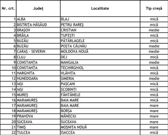 Ministerul Dezvoltarii a aprobat finantarea a inca 22 de crese moderne si eficiente din punct de vedere energetic, a anuntat ministrul dezvoltarii, lucrarilor publice si administratiei, Cseke Attila.Astfel, in Baia Mare, Suceava, Mosnita Noua, Borsa si Maneciu, va fi construita cate o cresa mare (pentru cate 100-110 copii). Localitatile Cristian, Mangalia, Simeria, Posta Calnau si Moldova Noua vor beneficia de cate o cresa medie (fiecare cu o capacitate de 70 de copii). Totodata, cate o cresa mica (pentru cate 40 de anteprescolari) va fi finantata in Blaj, Techirghiol, Dej, Vlahita, Pascani, Scobinti, Baia Mare, Fantanele, Isaccea, Petru Rares, Tufesti si Patarlagele.