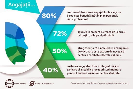 Revenirea economiei, o dinamica mai mare a activitatii companiilor si luarea unor masuri de siguranta in spatiile de lucru au dus in 2021 la revenirea in birouri, cel putin partiala, a multor angajati din sectorul public si privat in toata tara. Aproape trei sferturi (72,2%) dintre angajatii din Romania spun ca in prezent lucreaza de la birou cel putin 3 zile pe saptamana, desi efectele pandemiei sunt acum mai ample fata de anul trecut. Cei mai multi dintre ei considera ca reintoarcerea la birou are o contributie importanta la mentinerea unui echilibru emotional si la revenirea economiei, arata un sondaj initiat de Genesis Property in randul a 1.100 de angajati din toata tara, in perioada septembrie-octombrie.Totodata, jumatate dintre angajati atrag atentia ca o accelerare a campaniei de vaccinare este extrem de necesara pentru a combate efectele valului 4 al pandemiei. Circa 44% dintre ei considera ca este nevoie, in acest context, si de masuri suplimentare de igienizare si distantare sociala care sa limiteze raspandirea virusului, iar 38% vad necesara testarea mai frecventa a oamenilor.