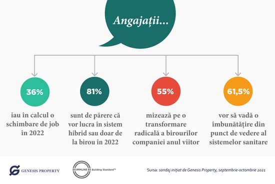 Spatiile de lucru au ramas un factor decisiv in luarea deciziilor privind alegerea locului de munca, in contextul in care sanatatea birourilor este in continuare esentiala pentru recastigarea increderii angajatilor, iar pandemia nu da semne ca se apropie de final. Astfel, asteptarile angajatilor legate de spatiile de lucru raman ridicate, iar peste o treime dintre ei spun ca ar putea lua in calcul o schimbare de job in 2022 bazata inclusiv pe motive legate de siguranta biroului lor sau de sistemul de lucru planificat de angajator pentru anul viitor, arata un sondaj initiat recent de Genesis Property in randul a 1.100 de angajati din toata tara.Peste 81% dintre respondenti sunt de parere ca vor lucra in sistem hibrid sau doar de la birou in 2022, in timp ce doar 11% cred ca angajatorul va opta ca echipa sa continue sa lucreze doar de acasa incepand din ianuarie, desi pandemia continua sa evolueze si riscurile pentru sanatate sunt in continuare ridicate. In acest context, tot mai multi simt nevoia ca biroul lor sa se adapteze nevoilor actuale si sa le ofere un cadru mai potrivit si mai sigur pentru a lucra.