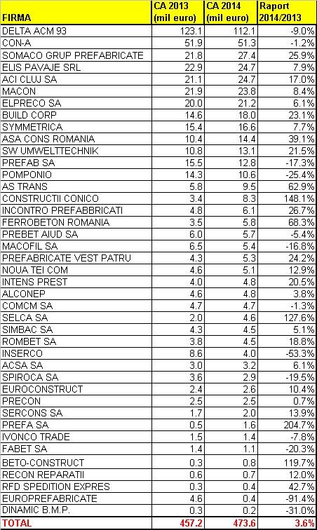 Piata prefabricatelor din beton a crescut, anul trecut, cu 4% din punct de vedere cantitativ, respectiv de la 1,28 milioane de metri cubi in 2013 la 1,33 milioane mc in 2014, potrivit datelor SW Umwelttechnik Romania, unul dintre liderii pietei locale de profil si subsidiara grupului austriac omonim. Totodata, valoarea vanzarilor din domeniu a ajuns la 220 milioane de euro, nivel cu 5% superior celui de 209 milioane de euro inregistrat la finele anului 2013. Structura domeniului s-a modificat anul trecut, cererea de produse pentru infrastructura de transport: grinzi de pod, podete, cadre prefabricate, elemente de drenaj, rigole fiind mai redusa, iar cea pentru sisteme de canalizare: camine, tuburi, prefabricate speciale din beton necesare sistemelor de canalizare, dar si in cazul elementelor prefabricate pentru structuri, inscriindu-se pe un trend ascendent. In continuare, principalele probleme cu care se confrunta producatorii locali de elemente prefabricate pentru beton raman, in special, cele legate de decontarea cu foarte mare intarziere a facturilor, atat in relatia cu antreprenorii generali, precum si cu subcontractorii lucrarilor, care, de asemenea, incaseaza cu destul de mari intarzieri finantarile de stat. Aceste intarzieri genereaza o lipsa a fluxului de numerar, care poate determina aparitia starii de insolventa a firmelor care activeaza in domeniul constructiilor. Alte probleme care afecteaza producatorii sunt cele legate de stoparea anumitor proiecte de investitii publice si a reducerii bugetului pentru investitii, precum si situatia politica actuala, care influenteaza in mod negativ realizarea investitiilor publice si private.